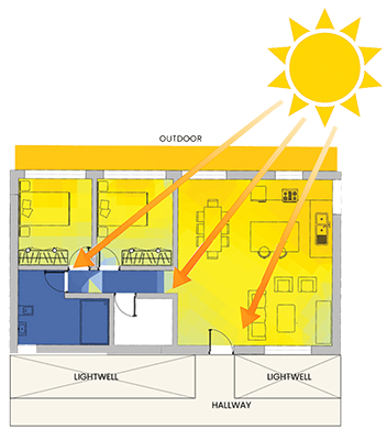 | Staircase | West, South west, South | less windows needed, avoids harsh light absorption into the building |